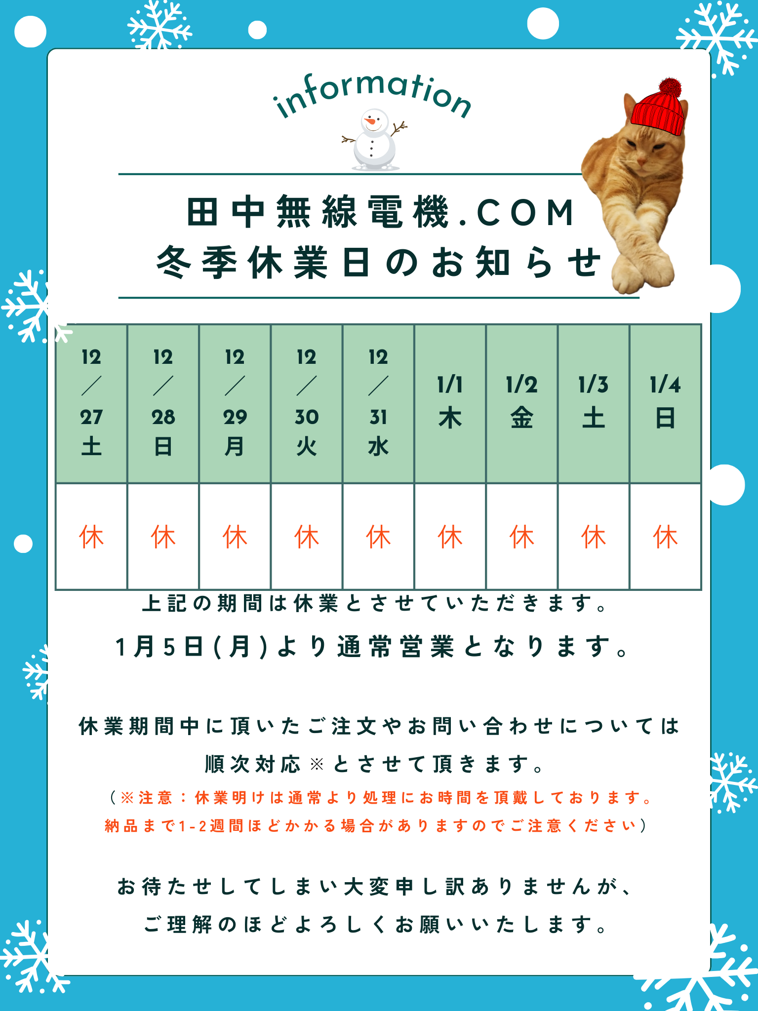 | 冬期休業日 | 2025年12月27日(土) 〜 2026年1月4日(日)まで ※12月27日(土)・28日(日)は工具店のみ営業いたします。 田中無線電機.COM、パーツ店、外販営業部は休業日となります。 |